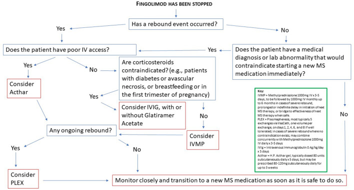 Because the treatment of multiple sclerosis (MS) may span decades, the need often arises to make changes to the treatment plan in order to accommodate changing circumstances. Switching drugs, or the discontinuation of immunomodulatory agents altogether, may leave patients vulnerable to relapse or disease progression. In some cases, severe MS disease activity is noted clinically and on MRI after treatment withdrawal. When this disease activity is disproportionate to the pattern observed prior to treatment initiation, patients are said to have experienced rebound. Of the US Food and Drug Administration (FDA)-approved agents to treat MS, the drugs most commonly implicated in rebound are natalizumab and fingolimod. In this review based on the reported cases and data from clinical trials, we characterize disease rebound after fingolimod cessation. We also outline fingolimod rebound management considerations, summarizing what evidence is available to help clinicians mitigate the risk of rebound, switch therapies, and treat rebound events when they occur. The commonly encountered situation of fingolimod discontinuation prior to pregnancy is also discussed.