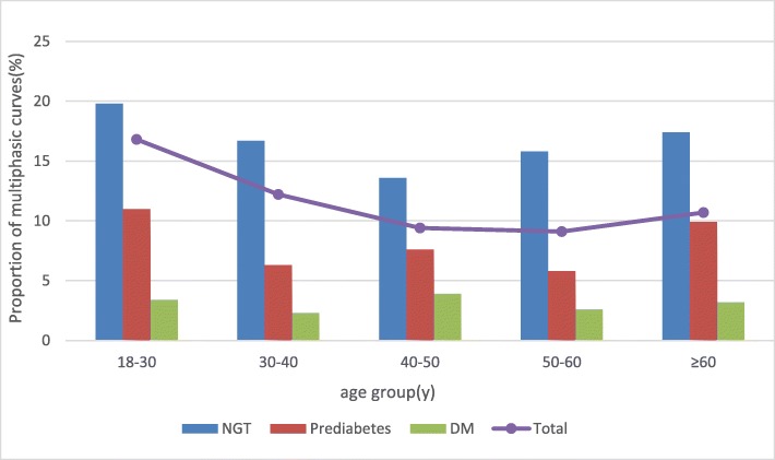 Results: The shape of the OGTT glucose response curve was monophasic in 87.3% and multiphasic in 12.7% of participants. Individuals in the multiphasic group were younger compared to those in the monophasic group (38.6 ± 13.6 vs. 35.4 ± 13.5, P < 0.001). Individuals in the monophasic group had significantly higher fasting plasma glucose (FPG 5.6 ± 13.5 vs. 5.2 ± 0.6, P < 0.001), fasting insulin (FINS 14.8 ± 8.7 vs. 13.5 ± 7.9, P < 0.01), and homeostasis model assessment of insulin resistance (HOMA-IR 3.8 ± 2.6 vs. 3.1 ± 2.0, P < 0.001) and impaired β-cell function (disposition index 12.7 ± 14.1 vs. 16.6 ± 17.8, P < 0.001) compared to those in the multiphasic group.