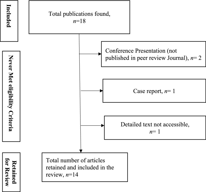 Results: The search identified a total of 18 articles out of which 14 (77.7%) fulfilled the criteria for inclusion and were retained for review. The articles were distributed across 12 countries where the pfhrp2 and pfhrp3 gene deletion studies were conducted and reported. The level of pfhrp2/3 gene deletion across selected studies in Africa ranged from the highest 62% to the lowest 0.4%. There was wide variation in methods and approaches including study designs, size and sampling and whether both pfhrp2 and pfhrp3 double deletions or pfhrp2 single deletion were investigated, with a wide variation in laboratory methods.