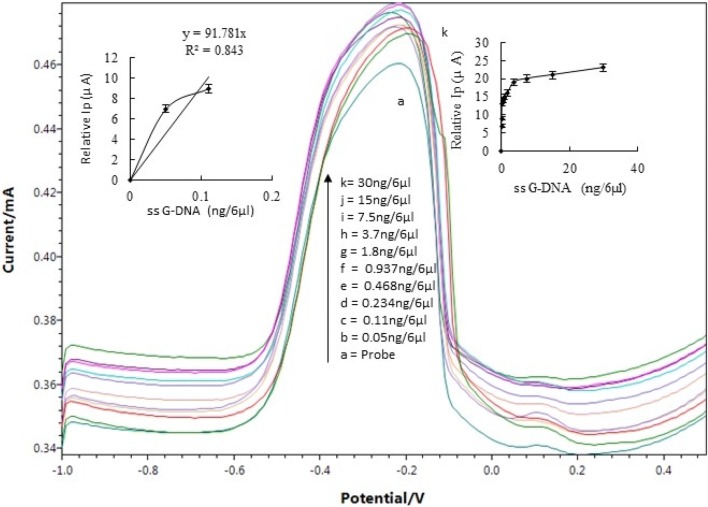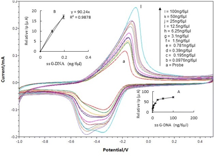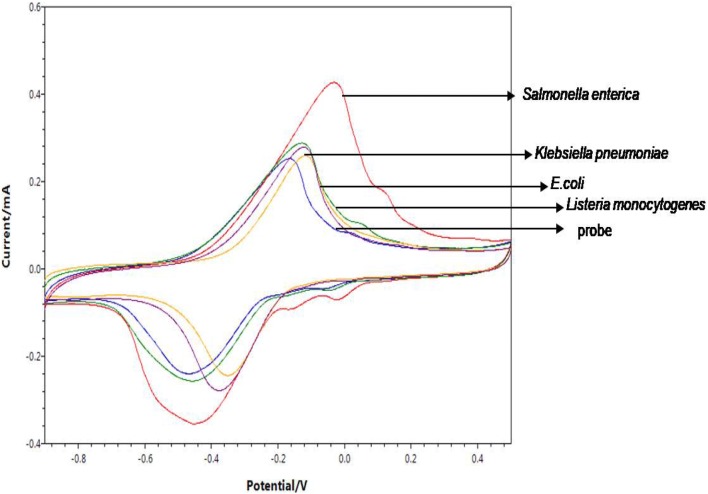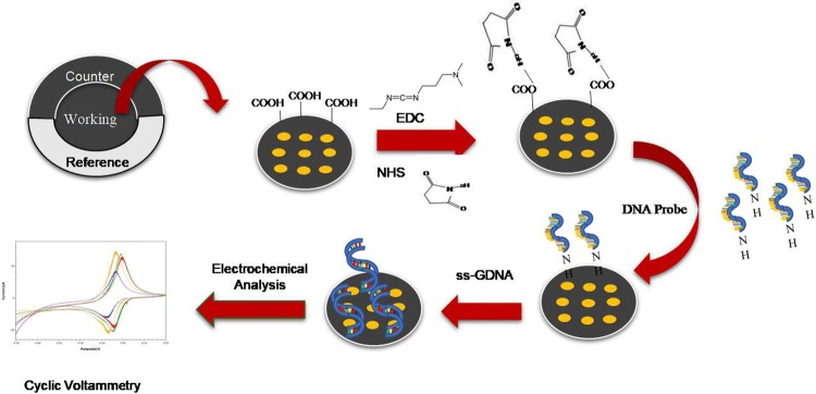 In this study, a DNA-based nanosensor using specific NH2 labeled single standard probe was developed against stn gene of Salmonella enterica in milk samples. The single-stranded DNA probe was immobilized on carboxylated multiwalled carbon nanotube and gold nanoparticle (c-MWCNT/AuNP) electrode using 1-Ethyl-3-(3-dimethylaminopropyl) carbodiimide (EDC): N-hydroxy succinimide-based cross-linking chemistry. Electrochemical characterization was performed using cyclic voltammetry (CV) and Differential Pulse Voltammetry (DPV) techniques. The electrode surface at each step of fabrication was characterized using scanning electron microscopy. The sensitivity and lower limit of detection were found to be 728.42 (μA/cm2)/ng and 1.8 pg/6 μl (0.3 pg/ml), respectively, with regression coefficient (R 2) of 0.843 using DPV. The sensor was further validated using raw and artificial milk samples, and results were compared with conventional methods of detection. The developed sensor was found to be highly sensitive and stable up to 6 months, with only 10% loss of initial peak current in CV analysis on storage at 4 °C.