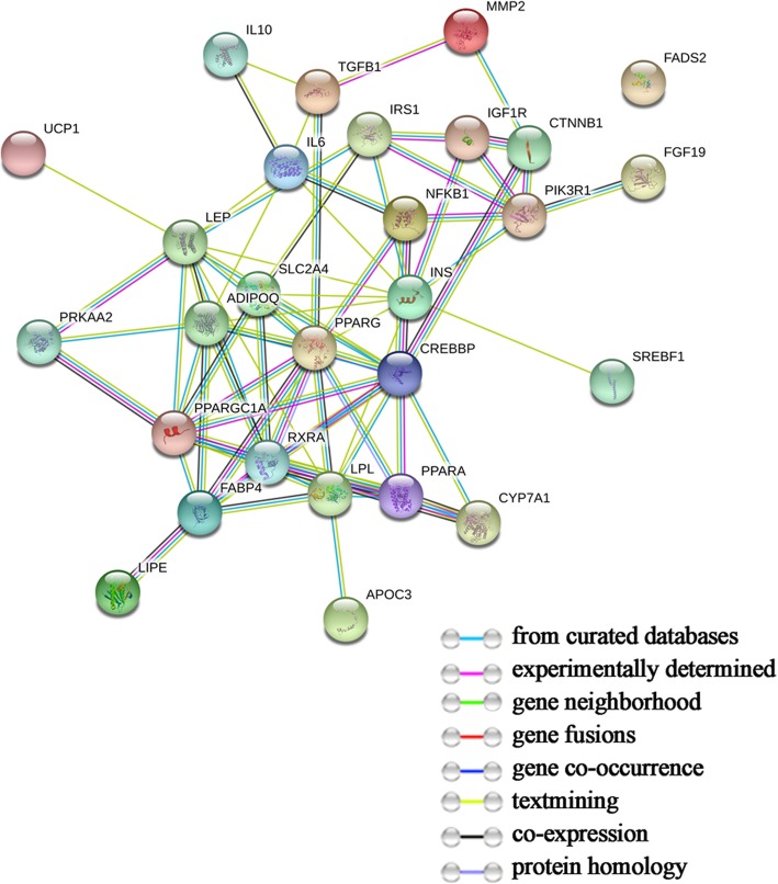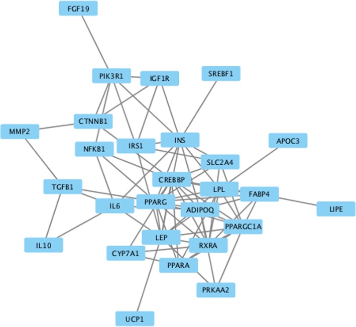 Results: In this study, we used text mining to find out genes related to brown fat and white fat browning. Combined with biological process and pathway analysis in GeneCodis and protein-protein interaction analysis by using STRING and Cytoscape, a list of high priority target genes was developed. The Human Protein Atlas was used to analyze protein expression. Candidate drugs were derived on the basis of the drug-gene interaction analysis of the final genes. Our study identified 18 genes representing 6 different pathways, targetable by a total of 33 drugs as possible drug treatments. The final list included 18 peroxisome proliferator-activated receptor gamma (PPAR-γ) agonists, 4 beta 3 adrenoceptor (β3-AR) agonists, 1 insulin sensitizer, 3 insulins, 6 lipase clearing factor stimulants and other drugs.