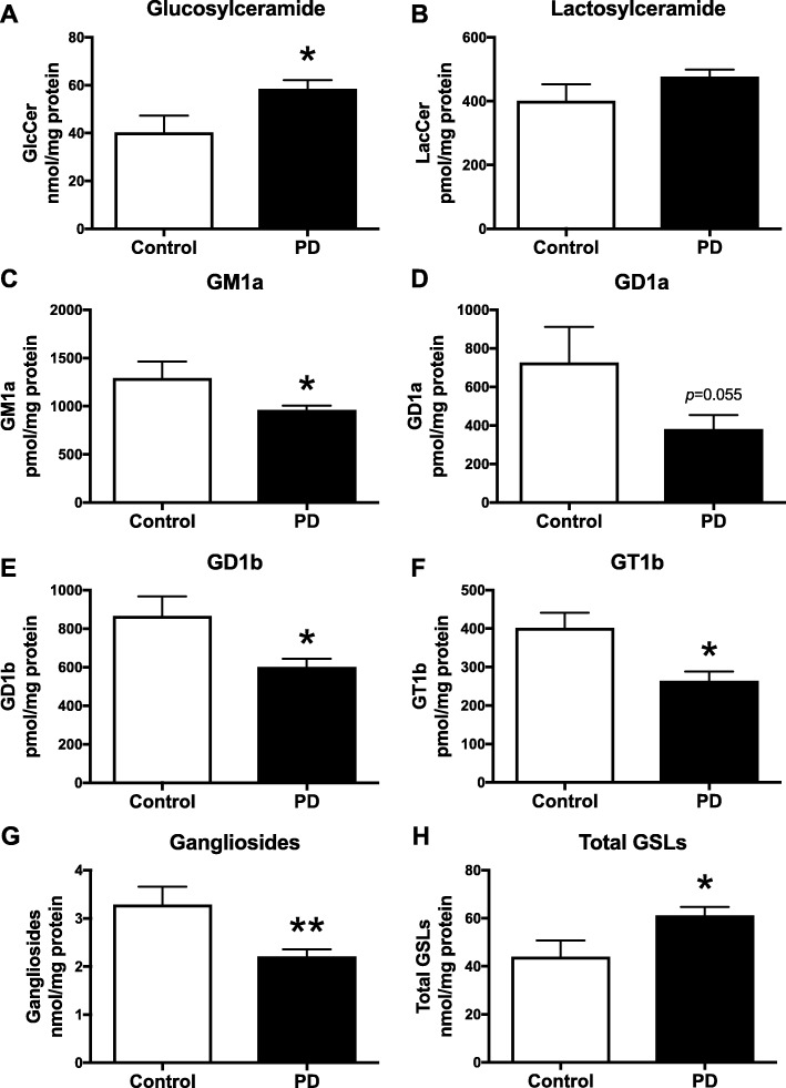 Conclusions: These findings conclusively demonstrate reductions in GBA activity in the parkinsonian midbrain, and for the first time, reductions in the activity of several other sphingolipid hydrolases. Furthermore, significant reductions were seen in complex gangliosides in PD and ageing. The diminished activities of these lysosomal hydrolases, the glycosphingolipid substrate accumulation, and the reduced levels of complex gangliosides are likely major contributors to the primary development of the pathology seen in PD and related disorders with age.
