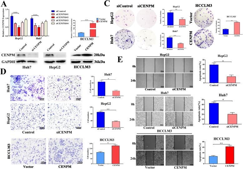 Methods: In this study, we first explored mRNA and protein levels of CENPM in HCC samples, matching adjacent non-tumor tissues and six hepatoma cell lines by polymerase chain reaction (PCR), western blotting and immunohistochemistry (IHC). Clinical data of HCC patients downloaded from The Cancer Genome Atlas (TCGA) were also analyzed. The character of CENPM concerned with HCC progression through several functional experimentations in vitro and in vivo was researched. Bioinformatics was carried out to further discover biological functions of CENPM.