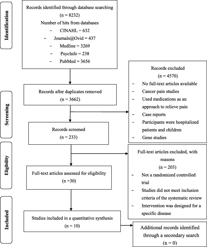Methods: Five databases, namely, CINHAL, Journals@Ovid, Medline, PsycInfo, and PubMed, were searched for articles. The criteria for inclusion were: full-text articles published in English from 2005 to February 2019 on randomized controlled trials, with chronic non-cancer pain as the primary outcome, in which pain was rated by intensity, using non-pharmacological interventions, and with participants over 65 years old, community-dwelling, and mentally competent. A quality appraisal using the Jadad Scale was conducted on the included articles.