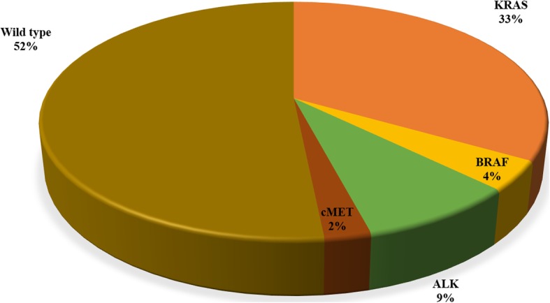 Results: KRAS mutations were the most common genetic alterations involving 22.1% of the cases and being mutually exclusive with the EGFR mutations, which were found in 12.6% of them. BRAF mutations, ALK rearrangements, and cMET amplifications were detected in 3.2, 5.3, and 2.1% of the cases, respectively. Concomitant mutations were detected only in a few cases.