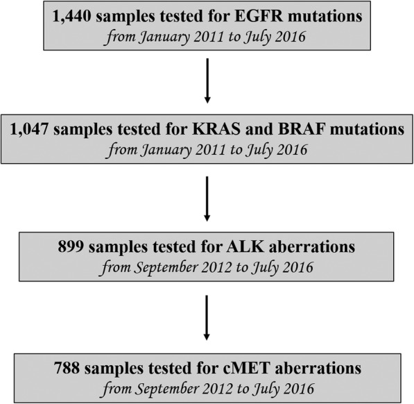 Methods: Data from 1440 consecutive Sardinian patients with a histologically proven diagnosis of lung adenocarcinoma from January 2011 through July 2016 were prospectively investigated. EGFR mutation analysis was performed for all of them, while KRAS and BRAF mutations were searched in 1047 cases; ALK alterations were determined with fluorescence in situ hybridization in 899 cases, and cMET amplifications in 788 cases.
