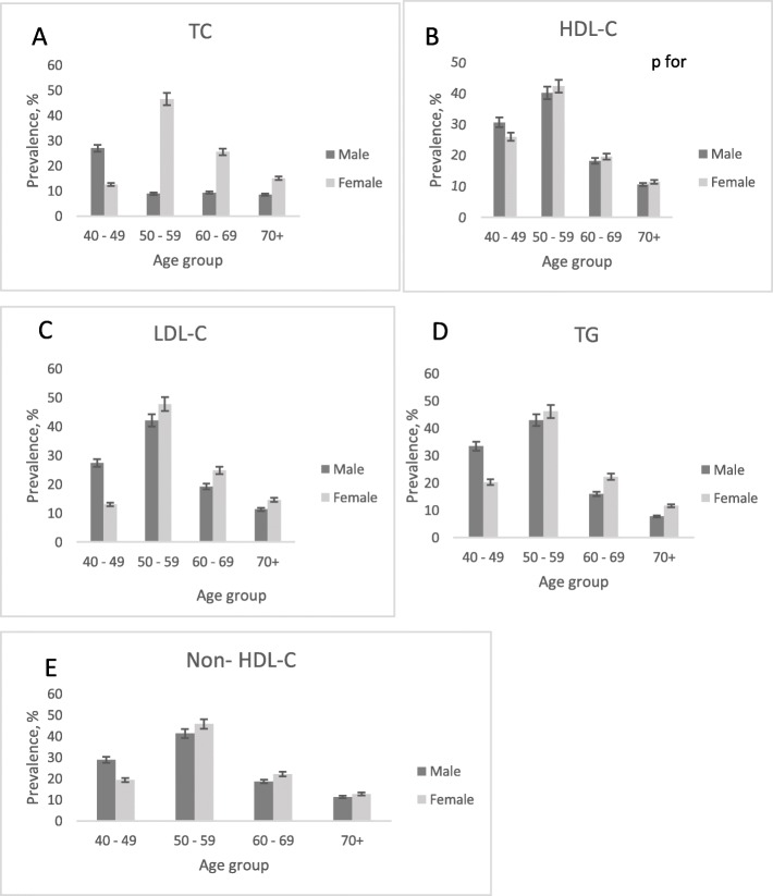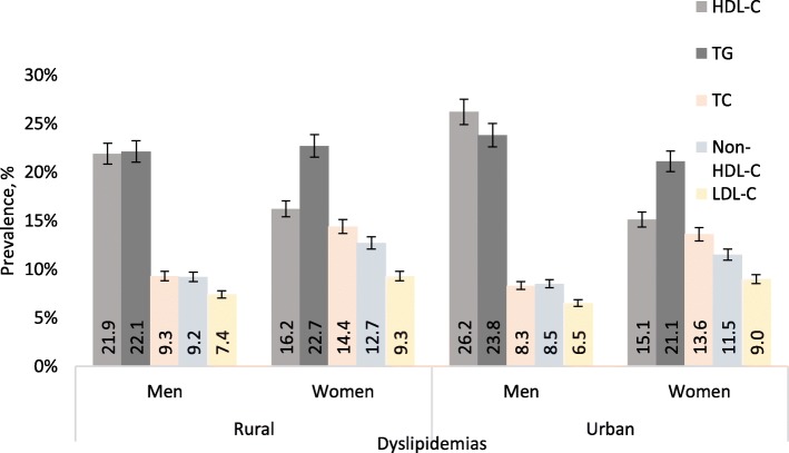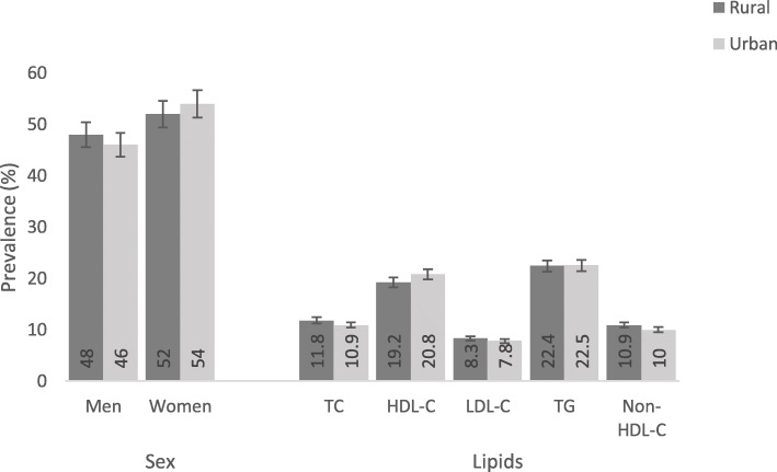 Results: A total of 53.1% participants lived in rural areas. The prevalence of dyslipidemia was similar among rural and urban participants (43.2% vs. 43.3%). Regarding the components of dyslipidemia: urban compared with rural participants had a higher prevalence of low HDL-C (20.8% vs. 19.2%), whereas the prevalence of raised LDL-C (7.8% vs. 8.3%), raised TC (10.9% vs.11.8%) and raised non-HDL-C (10.0% vs. 10.9%) were lower in urban residents, (all p < 0.001). Women were more likely to have raised TC than men (adjusted OR [AOR] =1.83, 95% confidence interval [CI]:1.75-1.91), raised LDL-C (AOR = 1.55, 95% CI: 1.47-1.63) and high non-HDL-C (AOR = 1.52 95% CI: 1.45-1.59) (all p < 0.001). Compared with rural, urban participants had higher odds of dyslipidemia: low HDL-C (AOR = 1.04, 95% CI: 1.01-1.07), and raised TG (AOR = 1.06, 95% CI: 1.04-1.09). Hypertension and current drinker were less likely to get low HDL-C with AOR 0.93 (95% CI: 0.90-0.96) and AOR 0.73 (95% CI: 0.70-75), respectively. Overweight, obesity, central obesity and diabetes had higher odds of all dyslipidemias (p < 0.001).