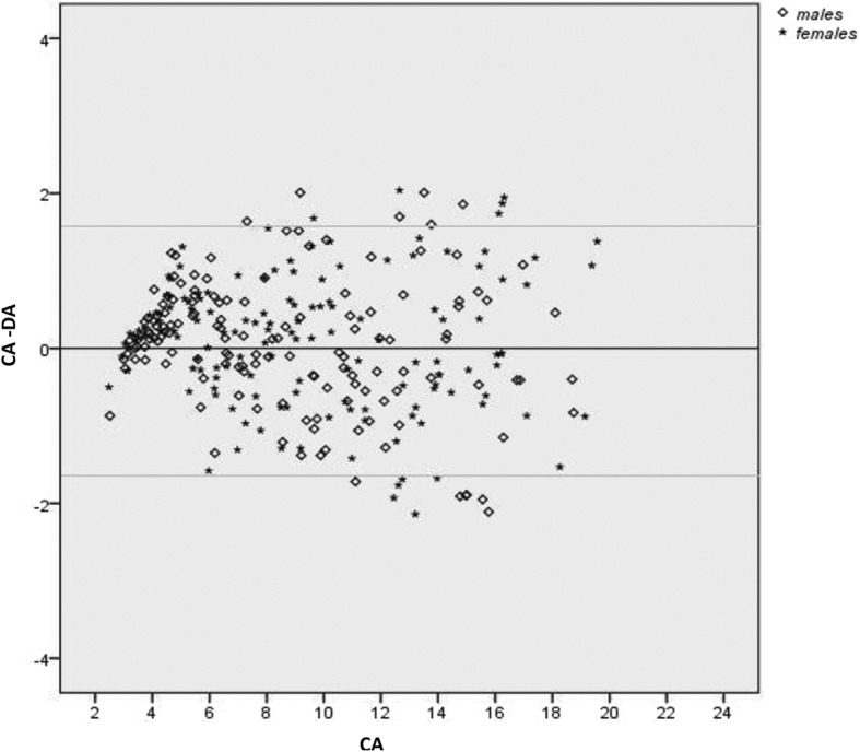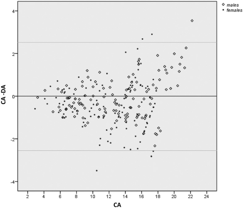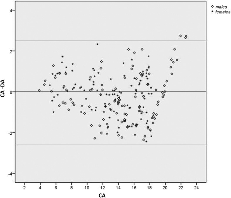 Methods: A total of 953 dental panoramic radiographs of subjects aged 2 to 24 years were obtained from Philippines, Thailand and Japan. The staging of dental development was conducted according to Anglo-Canadian classification system. The dental age (DA) was calculated using six methods; one un-weighted average and five weighted average (n-tds, sd-tds, se-tds, 1/sd-tds, 1/se-tds) methods based on the scores of the southern Han Chinese RDS. Statistical significance was set at p < 0.05 and the variation between chronological age (CA) and DA was evaluated using paired t-test and Bland & Altman scatter plots.