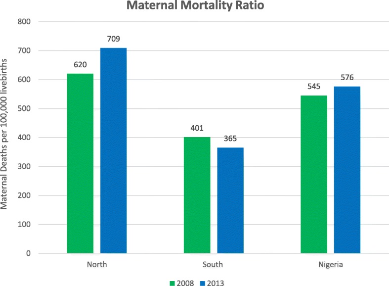 Background: Maternal mortality is still a major risk for women of childbearing age in Nigeria. In 2008, Nigeria bore 14% of the global burden of maternal mortality. The national maternal mortality ratio has remained elevated despite efforts to reduce maternal deaths. Though health disparities exist between the North and South of Nigeria, there is a dearth of evidence on the estimates and determinants of maternal mortality for these regions.
