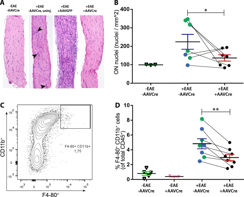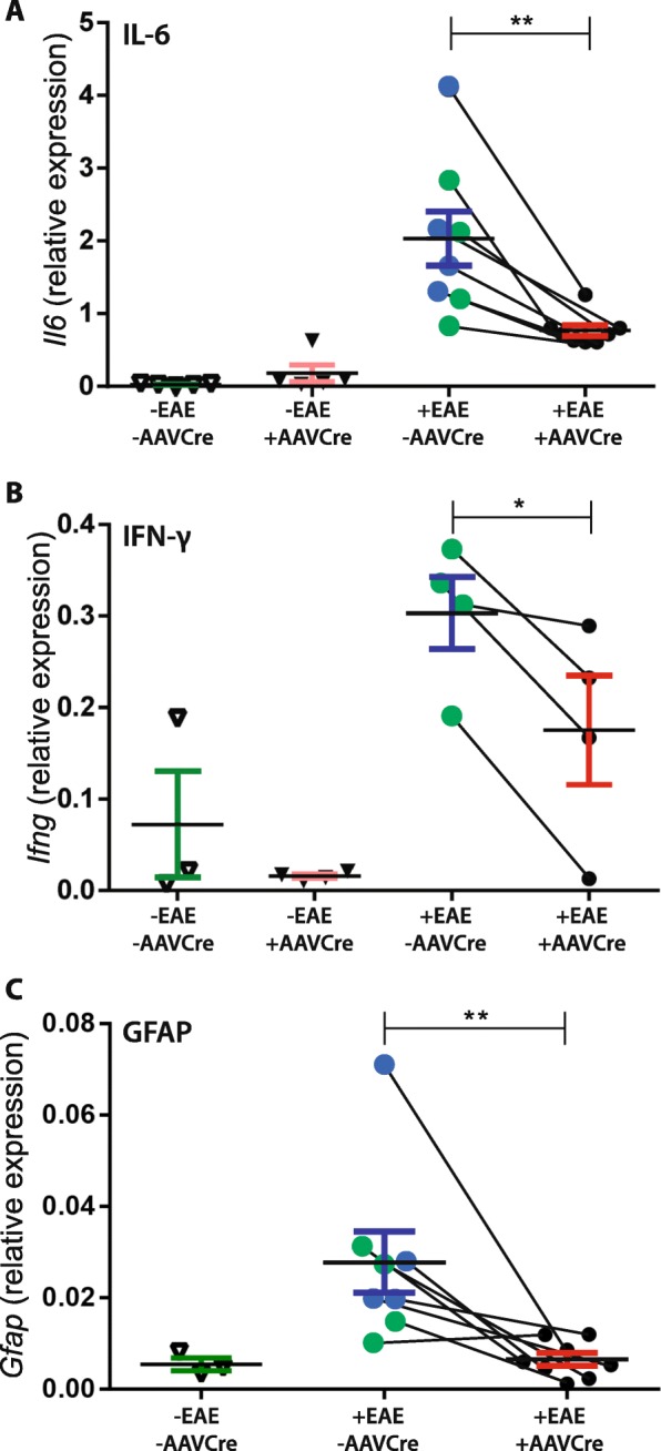 Methods: In mice floxed for Scn8a, the gene that encodes the α subunit of Nav1.6, subjected to EAE we examined the effect of eliminating Nav1.6 from retinal ganglion cells (RGC) in one eye using an AAV vector harboring Cre and GFP, while using the contralateral either injected with AAV vector harboring GFP alone or non-targeted eye as control.