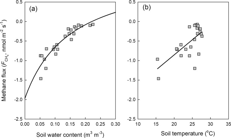 Although tropical forest soils contributed substantially global soil methane uptake, observations on soil methane fluxes in tropical forests are still sparse, especially in Southeast Asia, leading to large uncertainty in the estimation of global soil methane uptake. Here, we conducted two-year (from Sep, 2016 to Sep, 2018) measurements of soil methane fluxes in a lowland tropical forest site in Hainan island, China. At this tropical forest site, soils were substantial methane sink, and average annual soil methane uptake was estimated at 2.00 kg CH4-C ha-1 yr-1. The seasonality of soil methane uptake showed strong methane uptake in the dry season (-1.00 nmol m-2 s-1) and almost neutral or weak soil methane uptake in the wet season (-0.24 nmol m-2 s-1). The peak soil methane uptake rate was observed as -1.43 nmol m-2 s-1 in February, 2018, the driest and coolest month during the past 24 months. Soil moisture was the dominant controller of methane fluxes, and could explain 94% seasonal variation of soil methane fluxes. Soil temperature could not enhance the explanation of seasonal variation of soil methane fluxes on the top of soil moisture. A positive relationship between soil methane uptake and soil respiration was also detected, which might indicate co-variation in activities of methanotroph and roots and/or microbes for soil heterotrophic respiration. Our study highlights that tropical forests in this region acted as a methane sink.