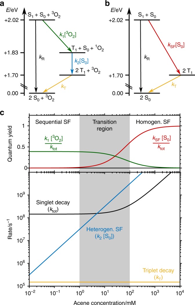Singlet fission is the photoinduced conversion of a singlet exciton into two triplet states of half-energy. This multiplication mechanism has been successfully applied to improve the efficiency of single-junction solar cells in the visible spectral range. Here we show that singlet fission may also occur via a sequential mechanism, where the two triplet states are generated consecutively by exploiting oxygen as a catalyst. This sequential formation of carriers is demonstrated for two acene-like molecules in solution. First, energy transfer from the excited acene to triplet oxygen yields one triplet acene and singlet oxygen. In the second stage, singlet oxygen combines with a ground-state acene to complete singlet fission. This yields a second triplet molecule. The sequential mechanism accounts for approximately 40% of the triplet quantum yield in the studied molecules; this process occurs in dilute solutions and under atmospheric conditions, where the single-step SF mechanism is inactive.