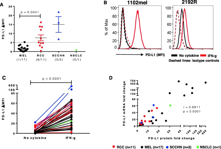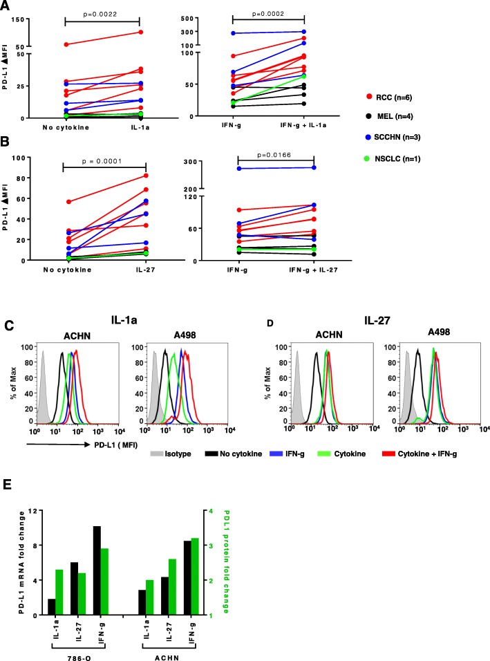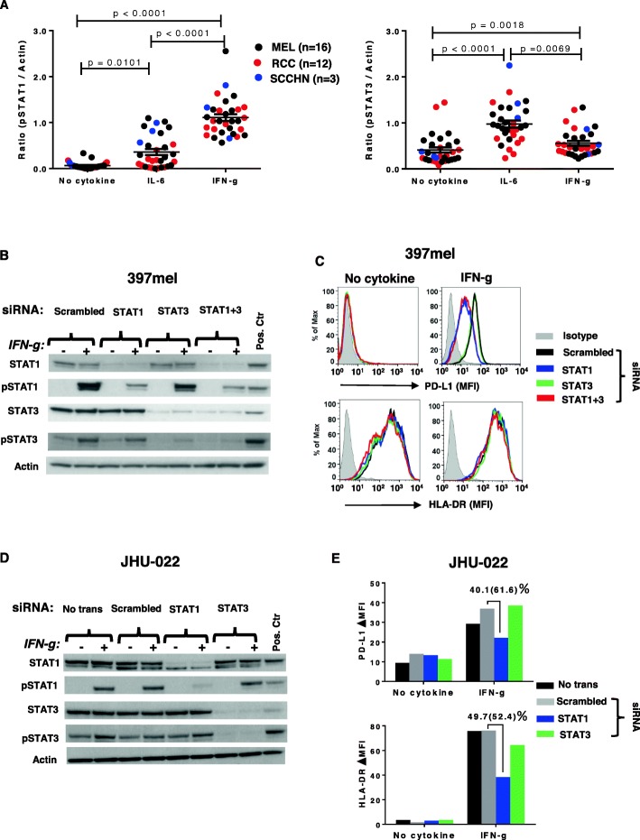 Results: PD-L1 was constitutively expressed on 1/17 cultured MELs, 8/11 RCCs, 3/3 SCCHNs, and on Monos. Brief IFN-g exposure rapidly induced PD-L1 on all tumor cell lines and Monos regardless of constitutive PD-L1 expression. PD-L1 mRNA levels were associated with protein expression, which was diminished by exposure to transcriptional inhibitors. siRNA knockdown of STAT1 but not STAT3 reduced IFN-g- and IL-27-induced PD-L1 protein expression on tumor cells. In contrast, STAT3 knockdown in Monos reduced IL-10-induced PD-L1 protein expression, and p65 knockdown in tumor cells reduced IL-1a-induced PD-L1 expression. Notably, constitutive PD-L1 expression was not affected by knocking down STAT1, STAT3, or p65. Differential effects of IFN-g, IL-1a, and IL-27 on individual tumor cell lines were not due to PDL1 promoter polymorphisms.