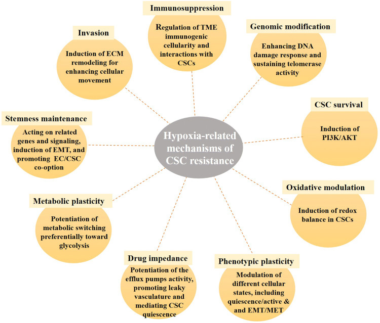 Purpose: Cancer stem cells (CSCs) are highly tumorigenic cell types that reside within specific areas of tumor microenvironment (TME), and are endowed with self-renewal and resistance properties. Here, we aimed to discuss mechanisms involved in hypoxia-derived CSC resistance and targeting for effective cancer therapy.