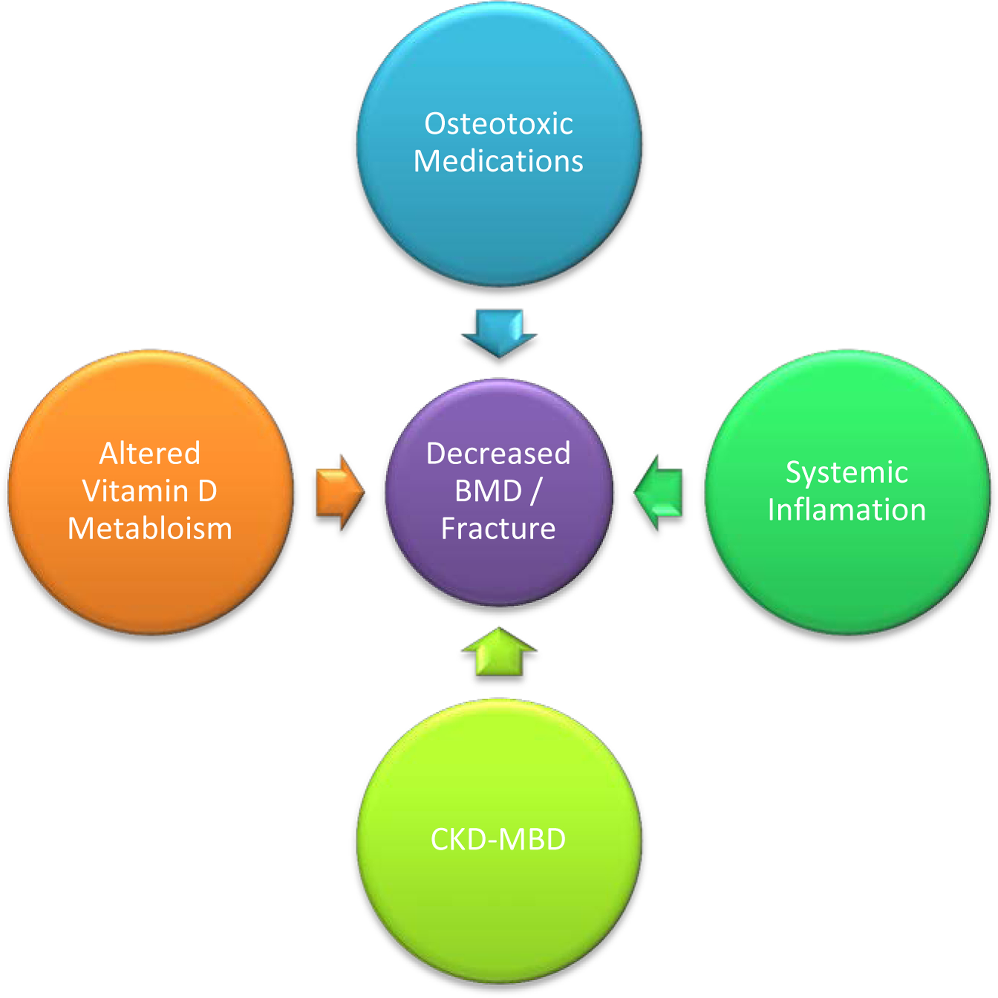 Recent findings: There is mounting evidence that children and adults with glomerular conditions, with or without compromised kidney function, comprise a distinct subgroup of patients with unique risk factors for altered bone health. Patients with glomerular kidney disease are exposed to both disease-related and treatment-related factors that affect bone structure and function. In addition to chronic kidney disease-related risk factors for impaired bone health, high rates of exposure to osteotoxic medications, varying degrees of systemic inflammation, and altered vitamin D metabolism may contribute to compromised bone health in individuals with glomerular disease. Further study is needed to better understand these risk factors and the complex interaction between the immune system and bone cells in glomerular disease.