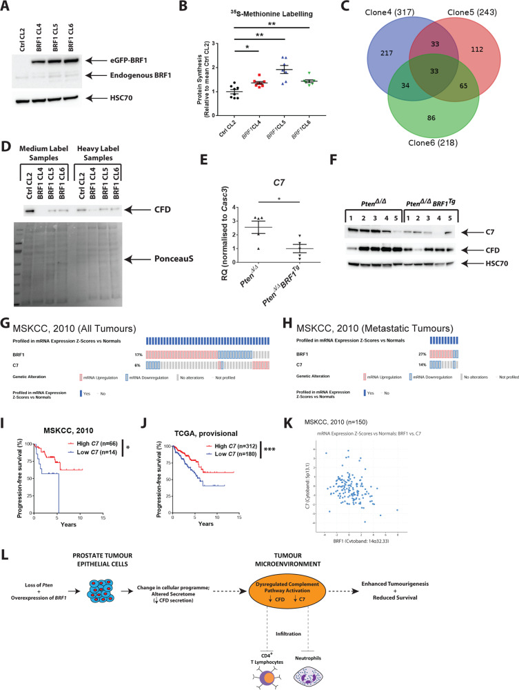 BRF1 is a rate-limiting factor for RNA Polymerase III-mediated transcription and is elevated in numerous cancers. Here, we report that elevated levels of BRF1 associate with poor prognosis in human prostate cancer. In vitro studies in human prostate cancer cell lines demonstrated that transient overexpression of BRF1 increased cell proliferation whereas the transient downregulation of BRF1 reduced proliferation and mediated cell cycle arrest. Consistent with our clinical observations, BRF1 overexpression in a Pten-deficient mouse (PtenΔ/Δ BRF1Tg) prostate cancer model accelerated prostate carcinogenesis and shortened survival. In PtenΔ/Δ BRF1Tg tumours, immune and inflammatory processes were altered, with reduced tumoral infiltration of neutrophils and CD4 positive T cells, which can be explained by decreased levels of complement factor D (CFD) and C7 components of the complement cascade, an innate immune pathway that influences the adaptive immune response. We tested if the secretome was involved in BRF1-driven tumorigenesis. Unbiased proteomic analysis on BRF1-overexpresing PC3 cells confirmed reduced levels of CFD in the secretome, implicating the complement system in prostate carcinogenesis. We further identify that expression of C7 significantly correlates with expression of CD4 and has the potential to alter clinical outcome in human prostate cancer, where low levels of C7 associate with poorer prognosis.