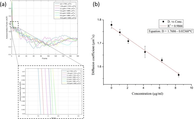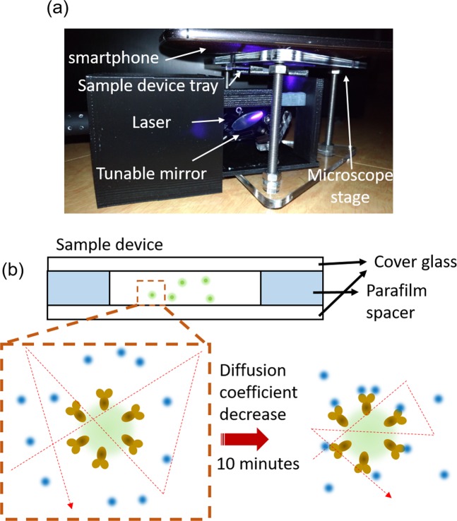In this study, we developed a portable smartphone-based diffusometry for analyzing the C-reactive protein (CRP) concentration. An optimized fluorescence microscopic add-on system for a smartphone was used to image the 300 nm fluorescent beads. Sequential nanobead images were recorded for a period and the image data were used for fluorescence correlation spectrometric (FCS) analysis. Through the analysis, the nanobeads' diffusion coefficient was obtained. Further, the diffusion coefficients of the anti-CRP-coated nanobeads, which were suspended in the samples with various CRP concentrations, were estimated using smartphone-based diffusometry. After 10 min of reaction, the anti-CRP-coated nanobeads in a higher CRP concentration solution led to a lower diffusion coefficient. Based on the experiments, a linear sensing range of 1~8 µg/mL was found.