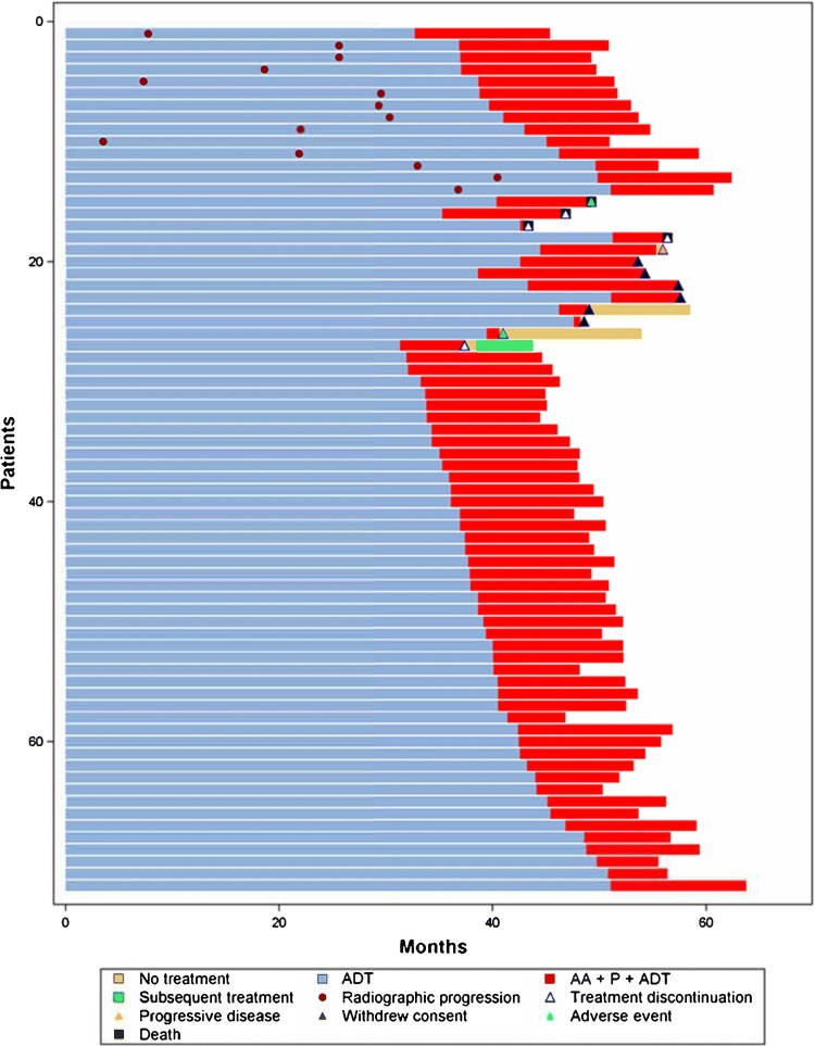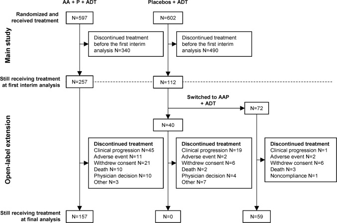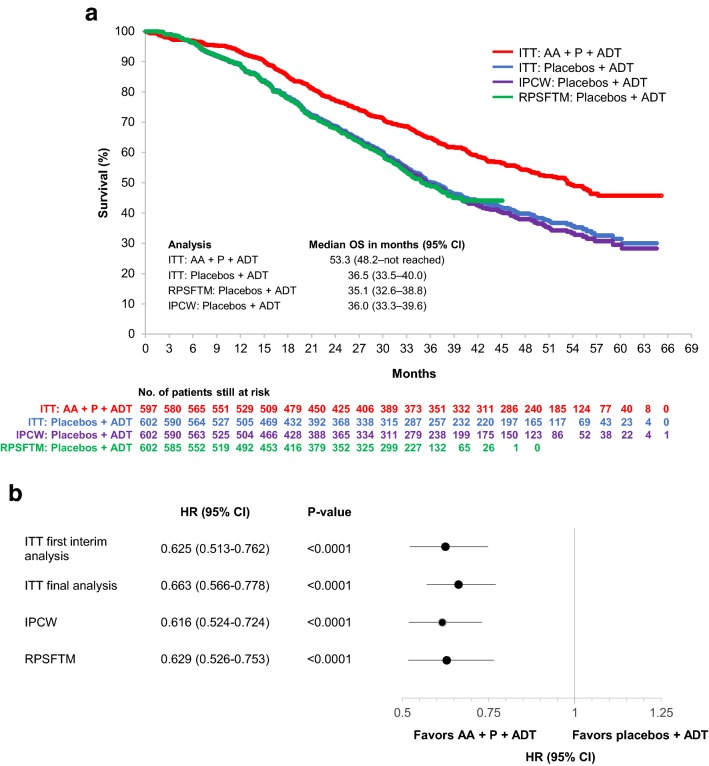 Results: Of 112 patients still receiving placebos + ADT at the first interim analysis, 72 switched to AA + P + ADT during the open-label extension. Final analysis was conducted after median follow-up of 51.8 months. Compared to the placebos + ADT arm, the risk of death in the AA + P + ADT arm was 34% lower [hazard ratio (HR) = 0.663 (95% confidence interval 0.566-0.778)] by unadjusted intent-to-treat analysis, 37% lower [HR = 0.629 (95% confidence interval 0.526-0.753)] by rank preserving structure failure time modeling, and 38% lower [HR = 0.616 (95% confidence interval 0.524-0.724)] by inverse probability of censoring weights.