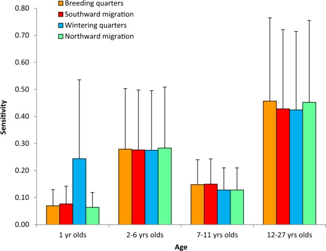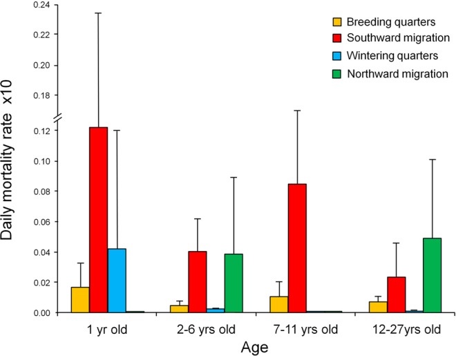 When and where mortality occurs throughout the annual cycle changes with age in a migratory bird: individual vs population implications