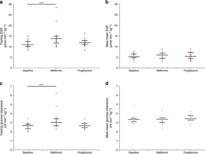 Fasting EGP (a); meal mean EGP (b); fasting glucose clearance (c) and meal mean glucose clearance (d) at all visits. Data are median (IQR) of all participants (n=15) in each cohort