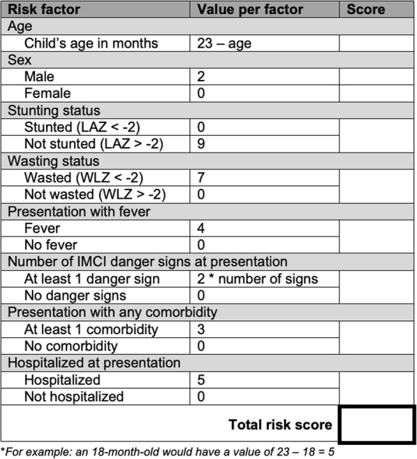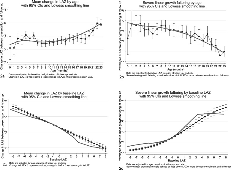 Results: Of the 5902 included children, mean age was 10 months and 43.2% were female. Over the 50-90-day follow-up period, 24.2% of children had severe linear growth faltering and the mean ΔLAZ over follow-up was - 0.17 (standard deviation [SD] 0.54). After adjustment for age, baseline LAZ, and site, several factors were associated with decline in LAZ: young age, acute malnutrition, hospitalization at presentation, non-dysenteric diarrhea, unimproved sanitation, lower wealth, fever, co-morbidity, or an IMCI danger sign. Compared to children 12-23 months old, those 0-6 months were more likely to experience severe linear growth faltering (adjusted prevalence ratio [aPR] 1.97 [95% CI 1.70, 2.28]), as were children 6-12 months of age (aPR 1.72 [95% CI 1.51, 1.95]). A prediction model that included age, wasting, stunting, presentation with fever, and presentation with an IMCI danger sign had an area under the ROC (AUC) of 0.67 (95% CI 0.64, 0.69). Risk scores ranged from 0 to 37, and a cut-off of 21 maximized sensitivity (60.7%) and specificity (63.5%).