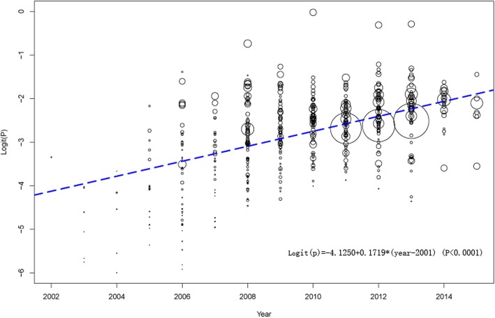 Results: Data were extracted from 355 cross-sectional studies (571,328 individuals) covered 59 cities from 30 provinces and municipalities of China. The overall national prevalence of HIV among MSM from 2001 to 2018 was estimated to be 5.7% (95% CI: 5.4-6.1%), with high between-study heterogeneity (I2 = 98.0%, P < 0.001). Our study showed an increased tendency in the HIV prevalence as time progressed by meta-regression analysis (I2 = 95.9%, P < 0.0001). HIV prevalence was the highest in those aged 50 years and older with HIV prevalence of 19.3% (95%CI: 13.1-27.4%, N = 13). HIV was more prevalent in the illiterate population (16.8%), than in those who had received an education. Although the internet was a major venue for Chinese MSM seeking male sex partners (35.6, 95%CI: 32.3-39.9%, N = 101), seeking MSM in bathhouses/saunas had the highest associated prevalence of HIV (13.4, 95%CI: 10.3-17.1%, N = 22). The HIV prevalence among MSM varied by location: compared with other regions in China, HIV was highly prevalent among MSM in the southwest (10.7, 95%CI: 9.3-12.2%, N = 91). Compared to participants who sometimes or always used condoms, participants who had never used a condom in the past 6 months had a higher risk of HIV infection, with odds ratios of 0.1 (95%CI: 0.08-0.14).
