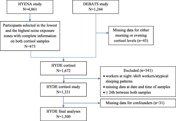 Methods: This study focused on the 1300 residents included in the HYENA and DEBATS cross-sectional studies, with complete information on cortisol sampling. All the participants followed a similar procedure aiming to collect both a morning and an evening saliva cortisol samples. Socioeconomic and lifestyle information were obtained during a face-to-face interview. Outdoor aircraft noise exposure was estimated for each participant's home address. Associations between aircraft noise exposure and cortisol outcomes were investigated a priori for male and female separately, using linear regression models adjusted for relevant confounders. Different approaches were used to characterize cortisol levels, such as morning and evening cortisol concentrations and the absolute and relative variations between morning and evening levels.