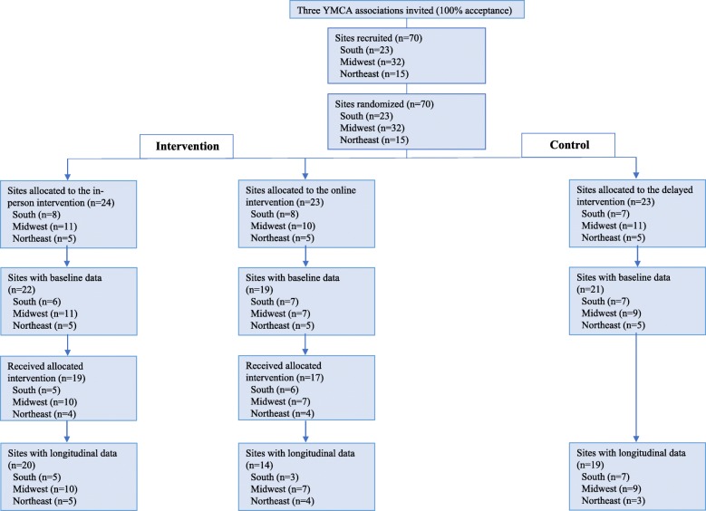 Methods: A 3-arm group-randomized trial was conducted to compare effectiveness of in-person and online training models for scaling up the intervention compared to controls. One-third of sites were randomized to the in-person train-the-trainer model: local YMCA facilitators attended a training session and then conducted three learning collaborative meetings and technical assistance. One-third were assigned to the online model, consisting of self-paced monthly learning modules, videos, quizzes, and facilitated discussion boards. Remaining sites served as controls. Fifty-three afterschool sites from three YMCA Associations in different regions of the country completed baseline and follow-up observations using a validated tool of afterschool nutrition and physical activity practices. We used multivariable regression models, accounting for clustering of observations, to assess intervention effects on an aggregate afterschool practice primary outcome, and conducted secondary analyses of nine intervention goals (e.g. serving water). Cost data were collected to determine the resources to implement each training model.