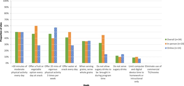 Results: Changes in the primary outcome indicate that, on average, sites in the in-person arm achieved 0.44 additional goals compared to controls (95%CI 0.02, 0.86, p = 0.04). Increases in the number of additional goals achieved in sites in the online arm were not significantly greater than control sites (+ 0.28, 95% CI -0.18, 0.73, p = 0.24). Goal-specific improvements were observed for increasing water offered in the in-person arm and fruits and vegetables offered in the online arm. The cost per person trained was $678 for the in-person training model and $336 for the on-line training model.
