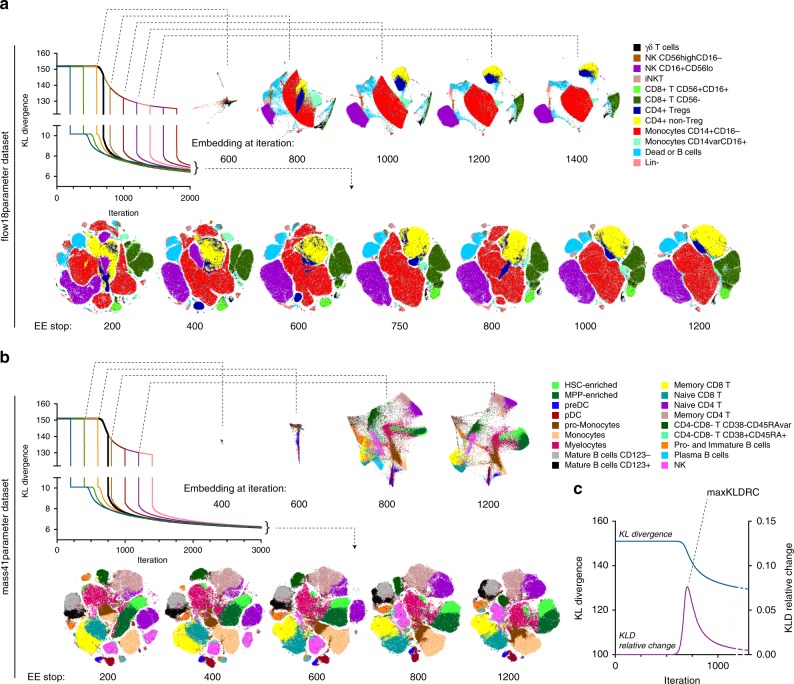Accurate and comprehensive extraction of information from high-dimensional single cell datasets necessitates faithful visualizations to assess biological populations. A state-of-the-art algorithm for non-linear dimension reduction, t-SNE, requires multiple heuristics and fails to produce clear representations of datasets when millions of cells are projected. We develop opt-SNE, an automated toolkit for t-SNE parameter selection that utilizes Kullback-Leibler divergence evaluation in real time to tailor the early exaggeration and overall number of gradient descent iterations in a dataset-specific manner. The precise calibration of early exaggeration together with opt-SNE adjustment of gradient descent learning rate dramatically improves computation time and enables high-quality visualization of large cytometry and transcriptomics datasets, overcoming limitations of analysis tools with hard-coded parameters that often produce poorly resolved or misleading maps of fluorescent and mass cytometry data. In summary, opt-SNE enables superior data resolution in t-SNE space and thereby more accurate data interpretation.