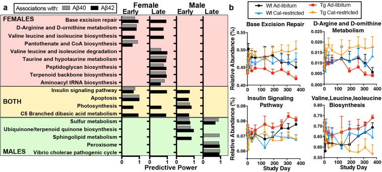 Alzheimer's disease (AD) affects an estimated 5.8 million Americans, and advanced age is the greatest risk factor. AD patients have altered intestinal microbiota. Accordingly, depleting intestinal microbiota in AD animal models reduces amyloid-beta (Aβ) plaque deposition. Age-related changes in the microbiota contribute to immunologic and physiologic decline. Translationally relevant dietary manipulations may be an effective approach to slow microbiota changes during aging. We previously showed that calorie restriction (CR) reduced brain Aβ deposition in the well-established Tg2576 mouse model of AD. Presently, we investigated whether CR alters the microbiome during aging. We found that female Tg2576 mice have more substantial age-related microbiome changes compared to wildtype (WT) mice, including an increase in Bacteroides, which were normalized by CR. Specific gut microbiota changes were linked to Aβ levels, with greater effects in females than in males. In the gut, Tg2576 female mice had an enhanced intestinal inflammatory transcriptional profile, which was reversed by CR. Furthermore, we demonstrate that Bacteroides colonization exacerbates Aβ deposition, which may be a mechanism whereby the gut impacts AD pathogenesis. These results suggest that long-term CR may alter the gut environment and prevent the expansion of microbes that contribute to age-related cognitive decline.