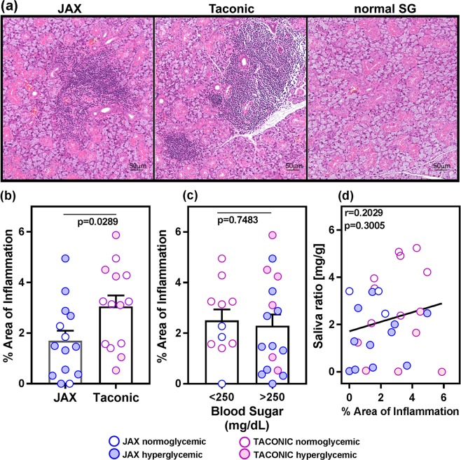 The Non-obese Diabetic (NOD) mouse model for type I diabetes also develops some features of Sjögren's syndrome (SS). Since the source of the mice and the environment exert a strong influence on diabetes, this study investigated SS development in NOD mice obtained from two vendors. Female NOD mice from The Jackson Laboratory (JAX) and Taconic Biosciences were monitored for blood glucose and pilocarpine-induced salivation. The gut microbiome was analyzed by 16S rRNA sequencing of stool DNA. At euthanasia, serum cytokines and sialoadenitis severity were evaluated. The onset of diabetes was significantly accelerated in JAX mice compared to Taconic mice. Although the gut microbiome between the two groups was distinct, both groups developed sialoadenitis. There was no correlation between the severity of sialoadenitis and reduced saliva production. Instead, salivary gland dysfunction was associated with hyperglycemia and elevation of serum IL1β, IL16, and CXCL13. Our data suggest that inflammatory pathways linked with hyperglycemia are confounding factors for salivary gland dysfunction in female NOD mice, and might not be representative of the mechanisms operative in SS patients. Considering that NOD mice have been used to test numerous experimental therapies for SS, caution needs to be exerted before advancing these therapeutics for human trials.