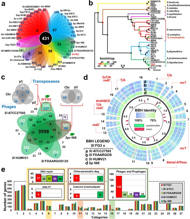 Serratia liquefaciens strain FG3 (SlFG3), isolated from the flower of Stachytarpheta glabra in the Brazilian ferruginous fields, has distinctive genomic, adaptive, and biotechnological potential. Herein, using a combination of genomics and molecular approaches, we unlocked the evolution of the adaptive traits acquired by S1FG3, which exhibits the second largest chromosome containing the largest conjugative plasmids described for Serratia. Comparative analysis revealed the presence of 18 genomic islands and 311 unique protein families involved in distinct adaptive features. S1FG3 has a diversified repertoire of genes associated with Nonribosomal peptides (NRPs/PKS), a complete and functional cluster related to cellulose synthesis, and an extensive and functional repertoire of oxidative metabolism genes. In addition, S1FG3 possesses a complete pathway related to protocatecuate and chloroaromatic degradation, and a complete repertoire of genes related to DNA repair and protection that includes mechanisms related to UV light tolerance, redox process resistance, and a laterally acquired capacity to protect DNA using phosphorothioation. These findings summarize that SlFG3 is well-adapted to different biotic and abiotic stress situations imposed by extreme conditions associated with ferruginous fields, unlocking the impact of the lateral gene transfer to adjust the genome for extreme environments, and providing insight into the evolution of prokaryotes.