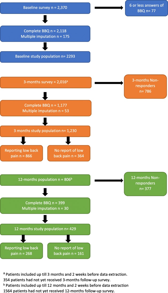 Methods: Patients aged over 18, consulting with LBP with or without radicular pain of all symptom durations, were recruited from chiropractic clinics. The BBQ was completed on the first visit and at 3- and 12-month follow-ups. Sociodemographic- and symptom-related questions were answered at baseline. A BBQ sum score was calculated at all three time points, and linear regression was used to analyse the cross-sectional association between baseline patient characteristics and BBQ scores. Wilcoxon signed-rank test was used to test differences in BBQ scores for patients with and without on-going LBP at 3- and 12-months follow up.