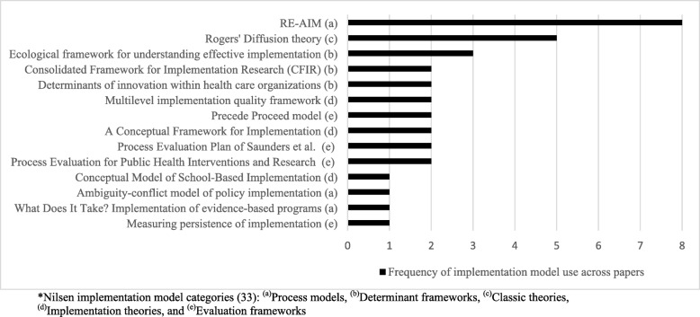 Results: 27 papers comprising 17 unique interventions were included. Fourteen implementation models (e.g., RE-AIM, Rogers' Diffusion of Innovations, Precede Proceed model), were applied across 27 papers. Implementation models were mostly used to interpret results (n = 9), for planning evaluation and interpreting results (n = 8), for planning evaluation (n = 6), for intervention design (n = 4), or for a combination of designing the intervention and interpreting results (n = 3). We identified 269 factors related to barriers (n = 93) and facilitators (n = 176) for the adoption (n = 7 studies), implementation (n = 14 studies) and sustainability (n = 7 studies) of interventions.