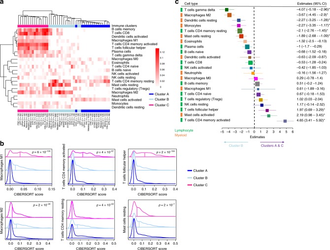 How mixtures of immune cells associate with cancer cell phenotype and affect pathogenesis is still unclear. In 15 breast cancer gene expression datasets, we invariably identify three clusters of patients with gradual levels of immune infiltration. The intermediate immune infiltration cluster (Cluster B) is associated with a worse prognosis independently of known clinicopathological features. Furthermore, immune clusters are associated with response to neoadjuvant chemotherapy. In silico dissection of the immune contexture of the clusters identified Cluster A as immune cold, Cluster C as immune hot while Cluster B has a pro-tumorigenic immune infiltration. Through phenotypical analysis, we find epithelial mesenchymal transition and proliferation associated with the immune clusters and mutually exclusive in breast cancers. Here, we describe immune clusters which improve the prognostic accuracy of immune contexture in breast cancer. Our discovery of a novel independent prognostic factor in breast cancer highlights a correlation between tumor phenotype and immune contexture.