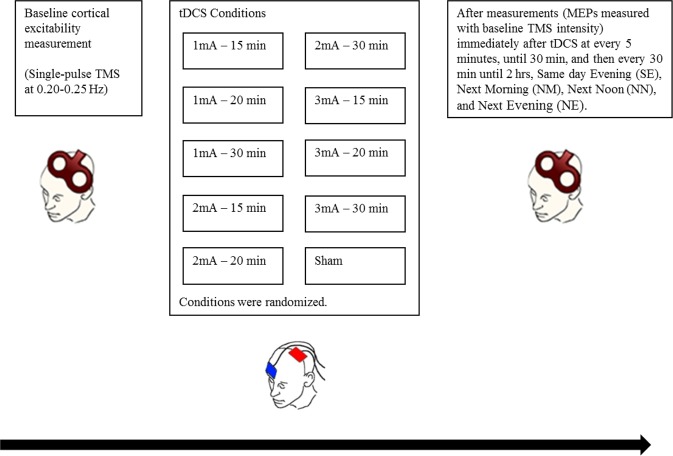 Size and duration of the neuroplastic effects of tDCS depend on stimulation parameters, including stimulation duration and intensity of current. The impact of stimulation parameters on physiological effects is partially non-linear. To improve the utility of this intervention, it is critical to gather information about the impact of stimulation duration and intensity on neuroplasticity, while expanding the parameter space to improve efficacy. Anodal tDCS of 1-3 mA current intensity was applied for 15-30 minutes to study motor cortex plasticity. Sixteen healthy right-handed non-smoking volunteers participated in 10 sessions (intensity-duration pairs) of stimulation in a randomized cross-over design. Transcranial magnetic stimulation (TMS)-induced motor-evoked potentials (MEP) were recorded as outcome measures of tDCS effects until next evening after tDCS. All active stimulation conditions enhanced motor cortex excitability within the first 2 hours after stimulation. We observed no significant differences between the three stimulation intensities and durations on cortical excitability. A trend for larger cortical excitability enhancements was however observed for higher current intensities (1 vs 3 mA). These results add information about intensified tDCS protocols and suggest that the impact of anodal tDCS on neuroplasticity is relatively robust with respect to gradual alterations of stimulation intensity, and duration.