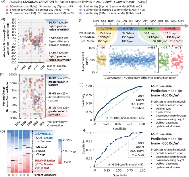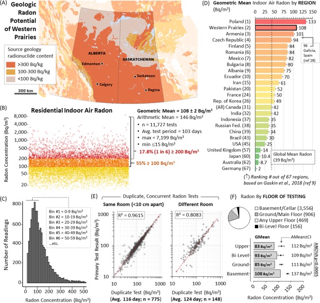 Human-made buildings can artificially concentrate radioactive radon gas of geologic origin, exposing occupants to harmful alpha particle radiation emissions that damage DNA and increase lung cancer risk. We examined how North American residential radon exposure varies by modern environmental design, occupant behaviour and season. 11,727 residential buildings were radon-tested using multiple approaches coupled to geologic, geographic, architectural, seasonal and behavioural data with quality controls. Regional residences contained 108 Bq/m3 geometric mean radon (min < 15 Bq/m3; max 7,199 Bq/m3), with 17.8% ≥ 200 Bq/m3. Pairwise analysis reveals that short term radon tests, despite wide usage, display limited value for establishing dosimetry, with precision being strongly influenced by time of year. Regression analyses indicates that the modern North American Prairie residential environment displays exceptionally high and worsening radon exposure, with more recent construction year, greater square footage, fewer storeys, greater ceiling height, and reduced window opening behaviour all associated with increased radon. Remarkably, multiple test approaches reveal minimal winter-to-summer radon variation in almost half of properties, with the remainder having either higher winter or higher summer radon. This challenges the utility of seasonal correction values for establishing dosimetry in risk estimations, and suggests that radon-attributable cancers are being underestimated.