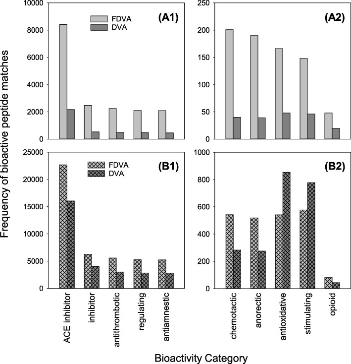 Methods: Peptides that were either free or located within proteins were identified in the DVA samples by liquid chromatography-tandem mass spectrometry (LC-MS/MS) followed by database searching. Bioactive peptides and cryptides were identified in silico by sequence matching against a database of known bioactive peptides. Angiotensin-converting enzyme (ACE) inhibitory activity was measured by a colorimetric method.