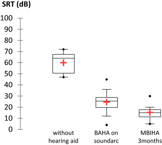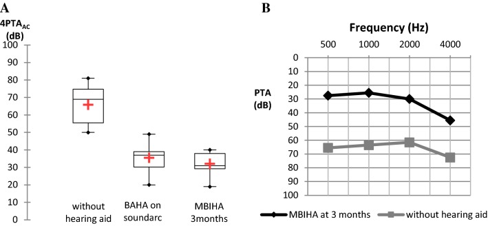 Results: We found a significant improvement of 33.8 dB on average for the PTA and 44.8 dB for the SRT with MBIHA at 3 months, compared with unaided situation. No implant was removed or displaced after 2 years of follow-up. The skin condition remains intact in all the cases.