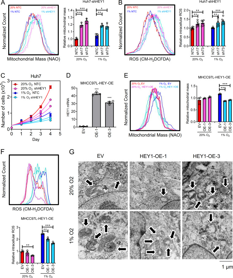 Hypoxia is commonly found in cancers. Hypoxia, due to the lack of oxygen (O2) as the electron recipient, causes inefficient electron transfer through the electron transport chain at the mitochondria leading to accumulation of reactive oxygen species (ROS) which could create irreversible cellular damages. Through hypoxia-inducible factor 1 (HIF-1) which elicits various molecular events, cells are able to overcome low O2. Knowledge about the new molecular mechanisms governed by HIF-1 is important for new therapeutic interventions targeting hypoxic tumors. Using hepatocellular carcinoma (HCC) as a model, we revealed that the HIF-1 and the Notch signaling pathways cross-talk to control mitochondrial biogenesis of cancer cells to maintain REDOX balance. From transcriptome sequencing, we found that HEY1, a transcriptional repressor, in the NOTCH pathway was consistently induced by hypoxia in HCC cell lines. We identified a strong hypoxia response element (HRE) in HEY1 by chromatin immunoprecipitation (ChIP) and luciferase reporter assays. Transcriptome and ChIP sequencing further identified PINK1, a gene essential for mitochondrial biogenesis, as a novel transcriptional target of HEY1. HCC cells with HEY1 knockdown re-expressed PINK1. HEY1 and PINK1 expressions inversely correlated in human HCC samples. Overexpression of HEY1 and under-expression of PINK1 were detected in human HCC and associated with poor clinical outcomes. Functionally, we found that overexpression of HEY1 or knockdown of PINK1 consistently reduced mitochondrial cristae, mitochondrial mass, oxidative stress level, and increased HCC growth.