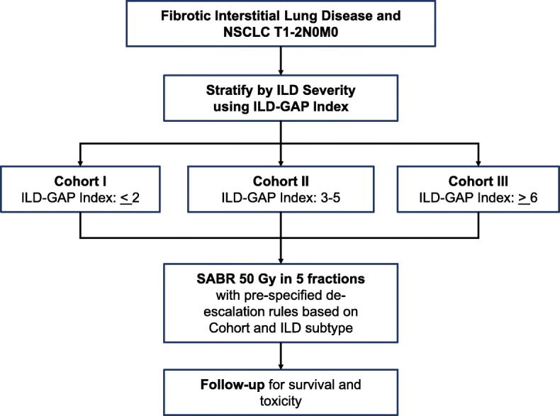 Methods: ASPIRE-ILD is a single-arm Phase II prospective study. The accrual target is 39 adult patients with T1-2N0M0 non-small cell lung cancer with co-existing ILD who are not candidates for surgical excision. Pathological confirmation of diagnosis is strongly recommended but not strictly required. Enrolled patients will be stratified by ILD-related mortality risk. The starting SABR dose will be 50 Gy in 5 fractions every other day (biologically effective dose: 100 Gy10 or 217 Gy3), but the radiation dose can be de-escalated up to two times to 50 Gy in 10 fractions daily (75 Gy10 or 133 Gy3) and 45 Gy in 15 fractions daily (58 Gy10 or 90 Gy3). Dose de-escalation will occur if 2 or more of the first 7 patients in a cohort experiences grade 5 toxicity within 6 months of treatment. Similarly, dose de-escalation can also occur if 2 or more of the first 7 patients with a specific subtype of ILD experiences grade 5 toxicity within 6 months of treatment. The primary endpoint is overall survival. Secondary endpoints include toxicity (CTC-AE 4.0), progression-free survival, local control, patient-reported outcomes (cough severity and quality of life), rates of ILD exacerbation and changes in pulmonary function tests/high-resolution computed tomography findings post-SABR.