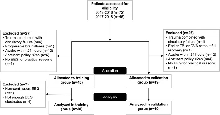 Results: Fifty-seven patients with moderate to severe TBI were included and divided into a training set (n = 38) and a validation set (n = 19). Our best model included eight qEEG parameters and MAP at 72 and 96 h after TBI, age, and nine other IMPACT parameters. This model had high predictive ability for poor outcome on both the training set using leave-one-out (area under the receiver operating characteristic curve (AUC) = 0.94, specificity 100%, sensitivity 75%) and validation set (AUC = 0.81, specificity 75%, sensitivity 100%). The IMPACT predictor independently predicted both groups with an AUC of 0.74 (specificity 81%, sensitivity 65%) and 0.84 (sensitivity 88%, specificity 73%), respectively.