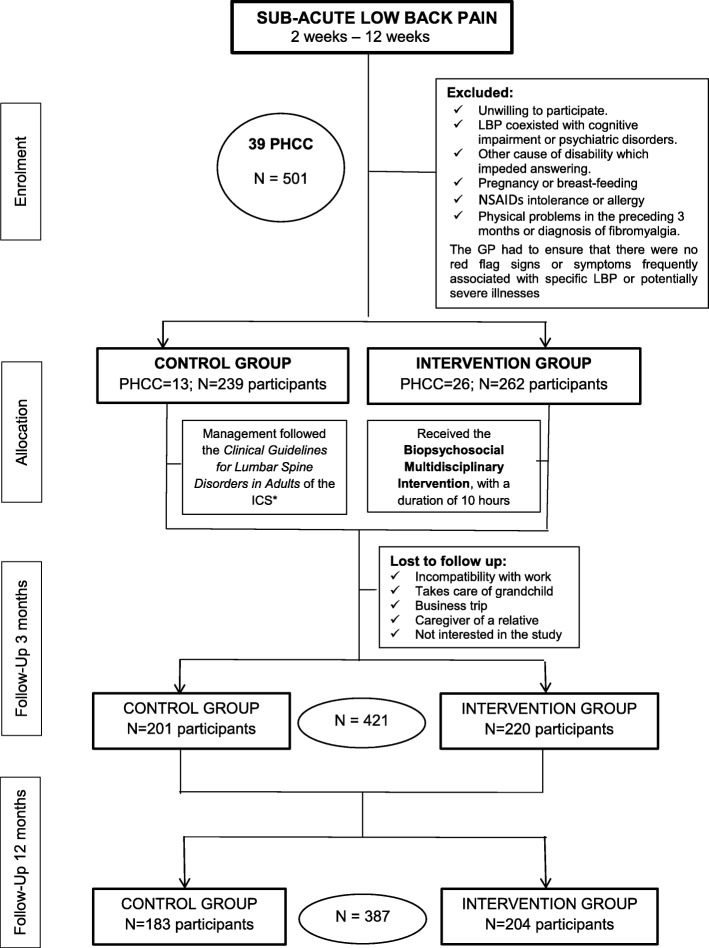 Methods: Longitudinal cluster randomized clinical trial conducted in 39 Primary Health Care Centres (PHCC) of Barcelona, with patients aged 18-65 years (n = 501; control group = 239; 26 PHCC, intervention group = 262; 13 PHCC). The control group received usual clinical care. The intervention group received usual clinical care plus a biopsychosocial multidisciplinary intervention, which consisted of physiotherapy, cognitive-behavioural therapy and medication. The main outcomes were changes in the Roland Morris Disability Questionnaire (RMDQ), and the minimal clinically important differences. Secondary outcomes were changes in the McGill Pain (MGPQ) and Quality of Life (SF-12) questionnaires. Assessment was conducted at baseline, 3 and 12 months. Analysis was by intention-to-treat and analyst-blinded. Multiple imputations were used.