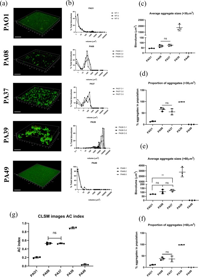 Non-surface attached bacterial aggregates are frequently found in clinical settings associated with chronic infections. Current methods quantifying the extent to which a suspended bacterial population is aggregated mainly rely on: (1) cell size distribution curves that are difficult to be compared numerically among large-scale samples; (2) the average size/proportion of aggregates in a population that do not specify the aggregation patterns. Here we introduce a novel application of Gini coefficient, herein named Aggregation Coefficient (AC), to quantify the aggregation levels of cystic fibrosis Pseudomonas aeruginosa (CF-PA) isolates in vitro using 3D micrographs, Fiji and MATLAB. Different aggregation patterns of five strains were compared statistically using the numerical AC indexes, which correlated well with the size distribution curves plotted by different biovolumes of aggregates. To test the sensitivity of AC, aggregates of the same strains were treated with nitric oxide (NO), a dispersal agent that reduces the biomass of surface attached biofilms. Strains unresponsive to NO were reflected by comparable AC indexes, while those undergoing dispersal showed a significant reduction in AC index, mirroring the changes in average aggregate sizes and proportions. Therefore, AC provides simpler and more descriptive numerical outputs for measuring different aggregation patterns compared to current approaches.