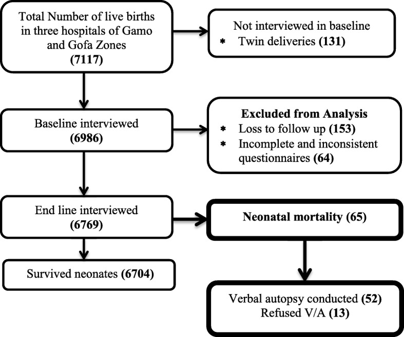 Methods: A prospective follow up study was conducted among 6769 study participants from April 5, 2018, to March 5, 2019. All live births at the hospitals during the study period were included in this study. A structured verbal autopsy questionnaire was used to collect the data on the causes of neonatal death. Data were entered into Epi data version 3.1 and exported to Stata version 15 for analysis. Crude and adjusted estimate β with 95%CI was calculated in the binary logistic regression model. A log-likelihood ratio (LR) was tested for goodness of fit. In this study P-value < 0.05 was considered to declare a result as a statistically significant association.