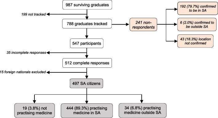 Results: The survey response rate was 51.8%. Foreign nationals were excluded from the analysis because of restrictions on them working in SA. Of 497 South African respondents, 60% had completed their vocational training in underserved areas. At the time of the study, 89% (444) worked as doctors in SA, 6.8% (34) practised medicine outside the country, and 3.8% (19) no longer practised medicine. Eighty percent of the 444 doctors still in SA worked in the public sector. Only 33 respondents (6.6%) worked in rural areas, of which 20 (60.6%) were Black. Almost half (47.7%) of the 497 doctors still in SA were in specialist training appointments.