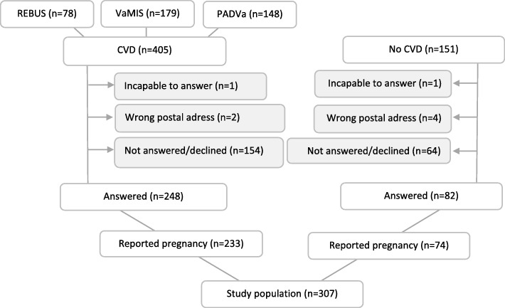 Methods: In total, 556 women were invited to participate in the study. Of these women 307 reported former pregnancy from a cohort of women with (n = 233) and without CVD (n = 74). The self-reported frequency of pregnancy complications were surveyed retrospectively by a questionnaire that included miscarriage, subfertility, gestational hypertension (GHT) and/or preeclampsia (PE), low birth weight, preterm birth, bleeding in late pregnancy, gestational diabetes mellitus and high birth weight. Three vascular beds were examined, the peripheral, carotid and coronary arteries.