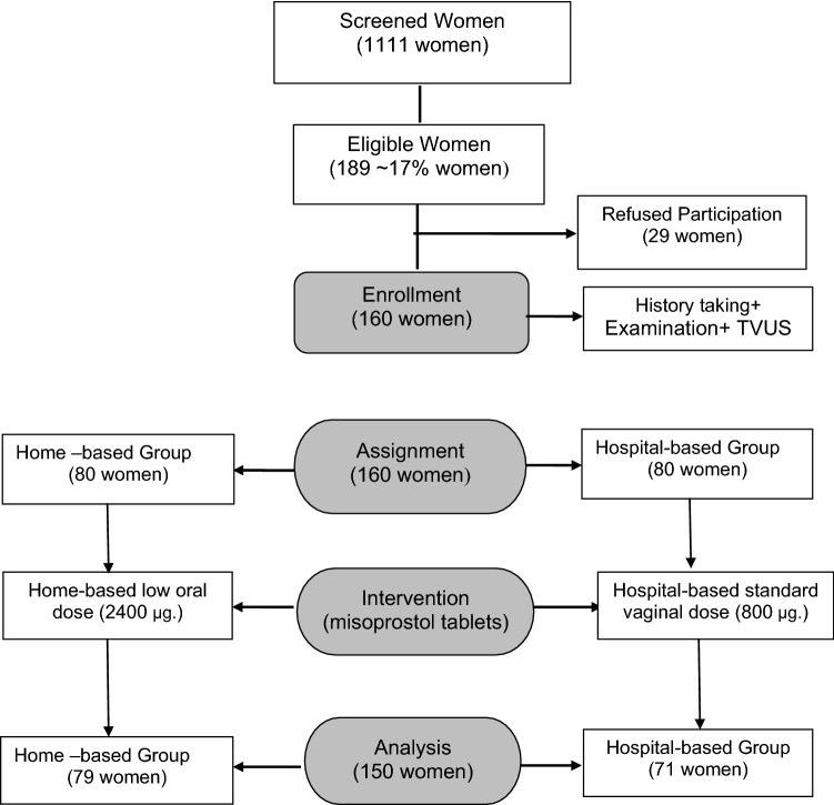 Materials and methods: A randomized trial that was conducted in the Woman's Health University Hospital and El-eman Maternity Hospital, Assiut, Egypt. One hundred and sixty patients were included. They were randomly assigned to receive four tablets of 200 μg misoprostol vaginally (max. 800 μg-hospital group) or 12 tablets orally, one every 3 h, over 2 consecutive days (max. 2400 μg-extended low-dose home group). For failed first dose, another similar second dose was given. Primary outcome measure was the percentage of patients with 'medically completed miscarriages' in each group (including complete miscarriages + incomplete miscarriages with successful post-miscarriage misoprostol).