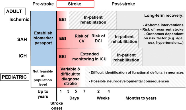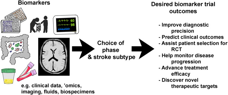 Stroke remains one of the leading causes of long-term disability and mortality despite recent advances in acute thrombolytic therapies. In fact, the global lifetime risk of stroke in adults over the age of 25 is approximately 25%, with 24.9 million cases of ischemic stroke and 18.7 million cases of hemorrhagic stroke reported in 2015. One of the main challenges in developing effective new acute therapeutics and enhanced long-term interventions for stroke recovery is the heterogeneity of stroke, including etiology, comorbidities, and lifestyle factors that uniquely affect each individual stroke survivor. In this comprehensive review, we propose that future biomarker studies can be designed to support precision medicine therapeutic interventions after stroke. The current challenges in defining ideal biomarkers for stroke are highlighted, including consideration of disease course, age, lifestyle factors, and subtypes of stroke. This overview of current clinical trials includes biomarker collection, and concludes with an example of biomarker design for aneurysmal subarachnoid hemorrhage. With the advent of "-omics" studies, neuroimaging, big data, and precision medicine, well-designed stroke biomarker trials will greatly advance the treatment of a disease that affects millions globally every year.